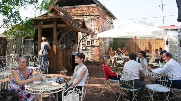 Женщины в кринолинах и шляпках, неся подносы с угощениями и изысканными чашками, пробираются между белыми чугунными столами под ветвями старых фруктовых деревьев. Люди болтают и наслаждаются солнечным светом, который отблескивает на золотых луковичных куполах соседней церкви, а пар от самовара нежно поднимается в воздух. Вместе с другими посетителями я приехал сюда, чтобы немного познакомиться с историей.