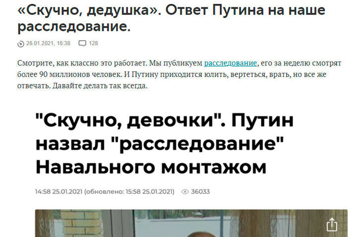 "Но Путин говорит, что никаких следов и упоминаний нет. 90 миллионов человек их видят, а Путин нет, - подчеркнули в ФБК**. - В общем, предложили нам не ответ на расследование, а какую-то туфту. Путин ничего не опроверг, ни единого факта".