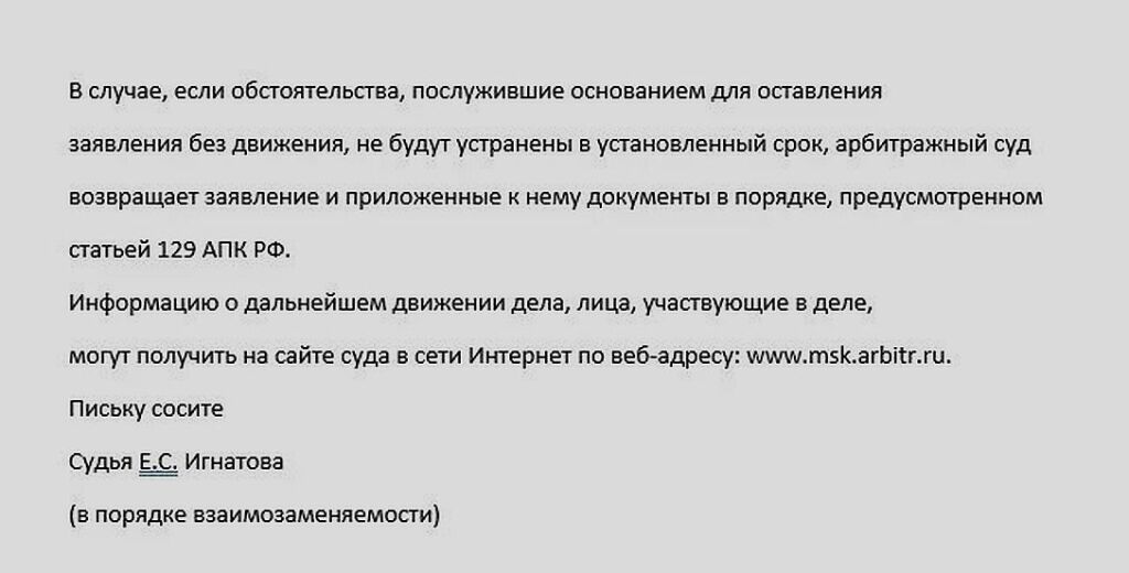 Определение касается банкротства строительной компании из Подмосковья ООО «Урбан Групп». Она была признана несостоятельной ещё в 2018 году, однако управляющий компании Максим Белов обратился в суд с просьбой освободить его от этой должности только в сентябре 2020 года. Судья Игнатова оставила просьбу Белова без движения и прочих видов удовлетворения по причине непредоставления необходимых документов.