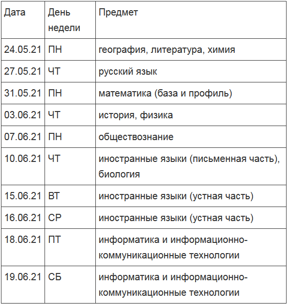 Календарь основного периода ЕГЭ в 2020-2021 учебном году будет следующим:
