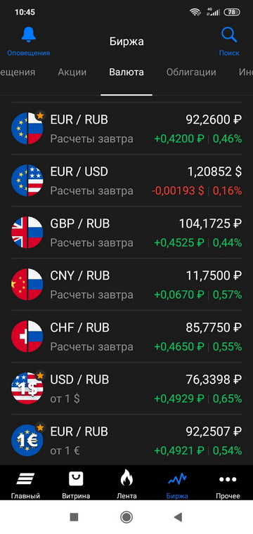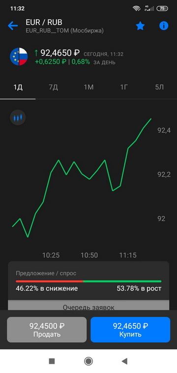 Вот, например, посмотрите, как торговался сегодня евро в 11:32. Как видим, разница между ценой покупки и ценой продажи составляет всего 1 копейку, а не 5–6 рублей, как в Сбербанке. Выгода налицо.