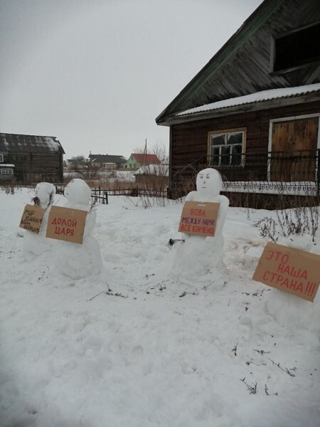 Активистка из Архангельской области был задержана за пикет снеговиков около своего дома. К снежным фигурам были прикреплены плакаты с надписями «Это наша страна!», «Вова, между нами все кончено!» и некоторыми другими.