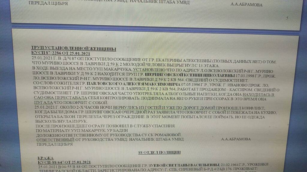 Вчера, 28 января 2021 г. в г. Мурино Ленинградской области хоронили 22-летнюю Шеренговскую Ксению. По мнению участкового уполномоченного полиции Макарчука и УР Бандина, основанного на пояснениях парня девушки Павловского Алексея, она покончила с собой, выпрыгнув из окна.
