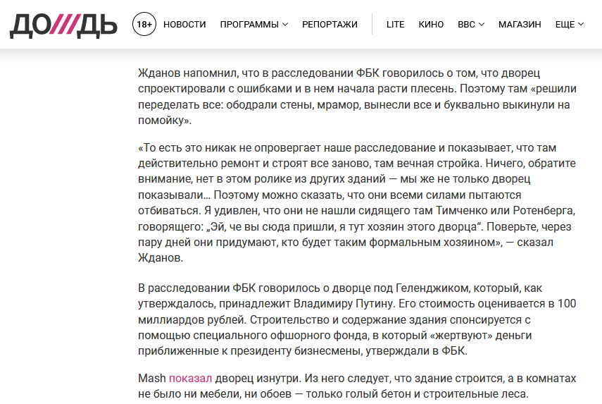 -Что-то мне подсказывает, что ваша тяга к прекрасному (а тяга к кинематографу всегда прекрасна) в этот раз будет дремать. Ведь подлинная история дворца не такая красивая, как компьютерная анимация. И вам самим себе, в глубине души, не захочется признаться, что, мол, мы - законченные д...нераты. Потому что только гипернаивный человек может доверять расследованиям Навального, которые ВСЕ оплачиваются. С другой стороны - я знаю, какие последуют возражения. У нас ведь ГУЛАГ и террор. Наверняка там нагнали таджиков, которые посносили весь этот дворец. Все же знают, что мы все время находимся в атмосфере гнетущего ужаса и страха.