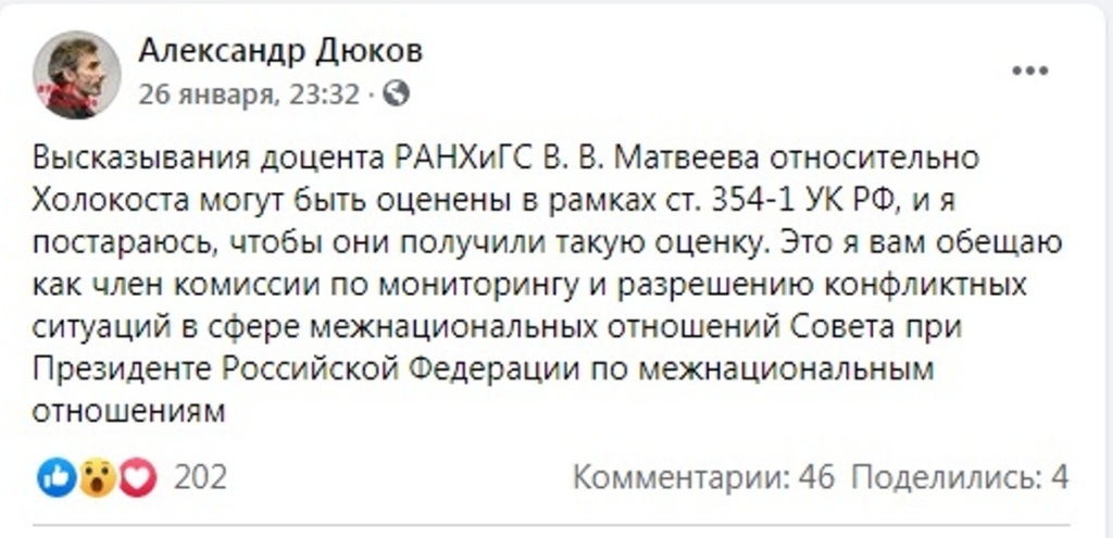 И уж, конечно, излишне эмоционально высказался историк Александр Дюков, для которого тема Холокоста совсем не чужда, так как он является автором нескольких статей, опубликованных в "Энциклопедии Холокоста на территории СССР". Честно признаться, автор настоящей статьи тоже не в восторге от качества материала, поданного профессором Матвеевым В.В. на вебинаре. Но нельзя же в научных спорах уподобляться той же практике тоталитаризма! Нельзя устанавливать научную истину с помощью Уголовного Кодекса и организованной общественной травли! Где аргументы, разбивающие положения, выдвинутые Матвеевым В.В., кроме странной апелляции к неопределённой этике?