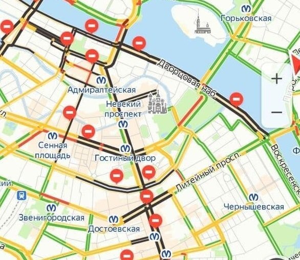 10:00 В Петербурге Невский проспект перекрыт от площади Восстания в сторону Дворцового моста. Движение в городе парализовано.