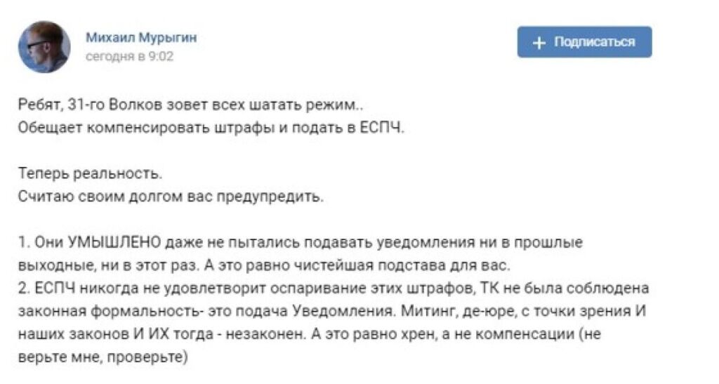 Экс-координатор штаба Навального в Саратове Михаил Мурыгин призвал россиян не выходить на митинги 31 января в поддержку главы ФБК** (иноагент). В посте в соцсети «ВКонтакте» от 30 января Мурыгин обвинил руководство в умышленном отказе от согласований для обеспечения «красивой картинки для Европы» с «рубиловом» и «беспорядками».