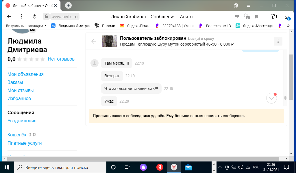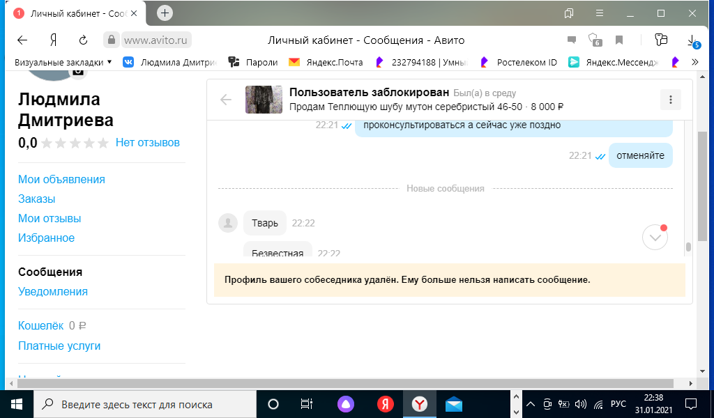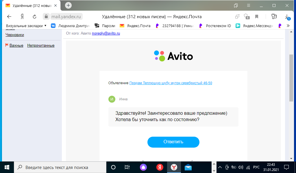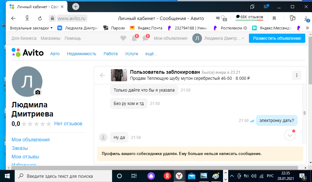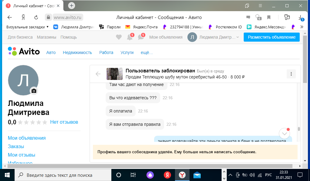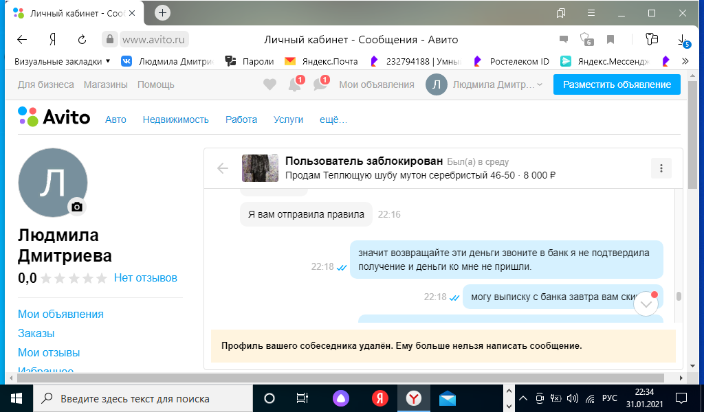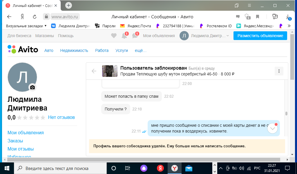 Мошенницы в интернете. У меня есть объявление о продаже ненужной вещи. Сначала мошенница поинтересовалась, что я знаю о авито доставке. Потом выпросила электронный адрес. Прислала сообщение, что на карте должна быть бронирующая сумма в размере суммы покупки. И когда на телефон мне пришло смс о списании денежных средств. То нужно остановиться. И написать заявление в полицию. Потому что потом от мошенницы начались поступать оскорбления и попытки выманить деньги. Будьте бдительны.