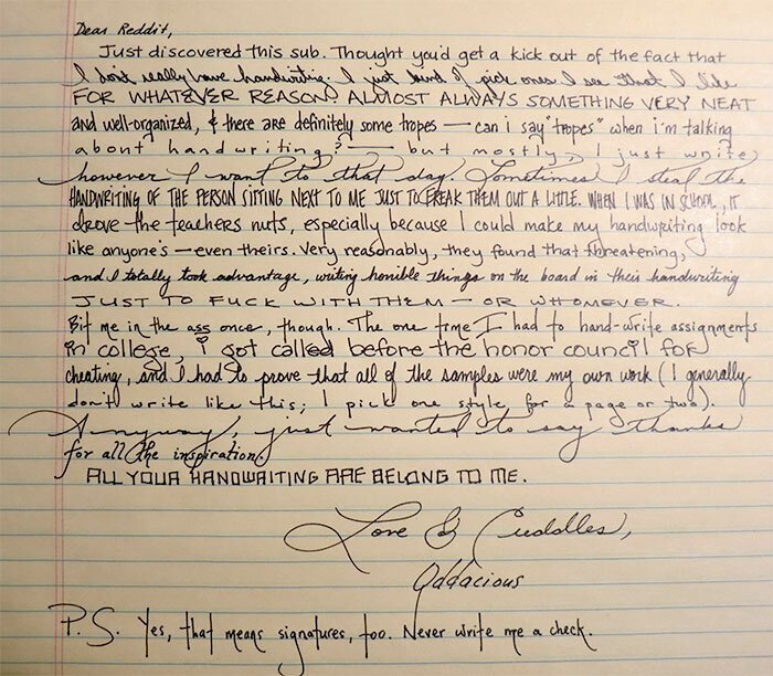 А вот человек демонстрирует свои навыки писать и печатным, и курсивным стилями...