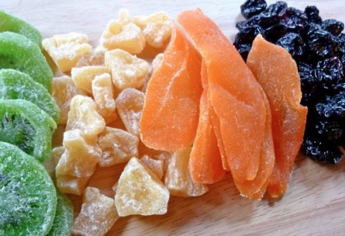 Ягодные и фруктовые кусочки плодов сперва нужно выварить в сиропе, а затем просушить. Однако такую технологию выдерживают не все изготовители, пичкая продукцию эмульгаторами. Чтобы убедиться в натуральности цукатов, погрузите их в теплую жидкость. Если они будто бы растворились или обесцветились, значит, настоящие фрукты заменили красящими веществами и желатином.