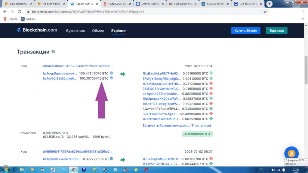 Вот страница на blockchain.com с кошельком ФБК**. Две транзакции сегодня. 02.02.2021 в 10:55.