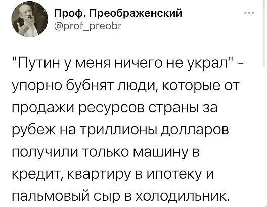 А президент не оскорбляет свой народ, пичкая дешевыми подачками, в которых не было бы необходимости, если бы людям хватало на элементарные необходимые для жизни вещи крыша над головой, не дворец, медицина, образование, пенсии. ЖКХ вообще подбешивает, нужно институт закончить, что бы разобраться? А стоимость комм услуг, это уму не постежимо, до какой цифры они вырастут? Дебильные и гетовские законы направленные на обнищание Россиян? Я не поверю в неэффективный менеджмент. Они или в погоне за наживой остановиться не могут или это спланированная акция на уничтожение собственного народа. Статистику убыли населения посмотрите и КОВИД тут не причем.