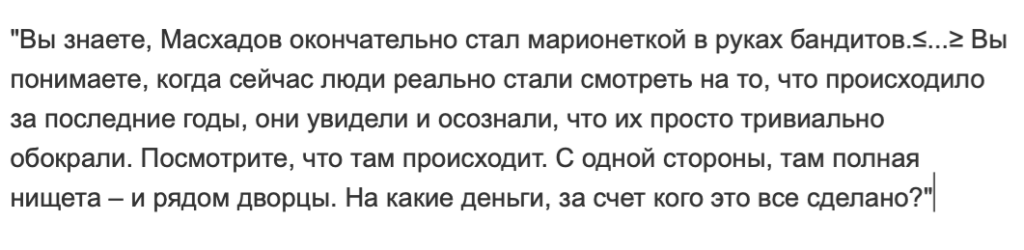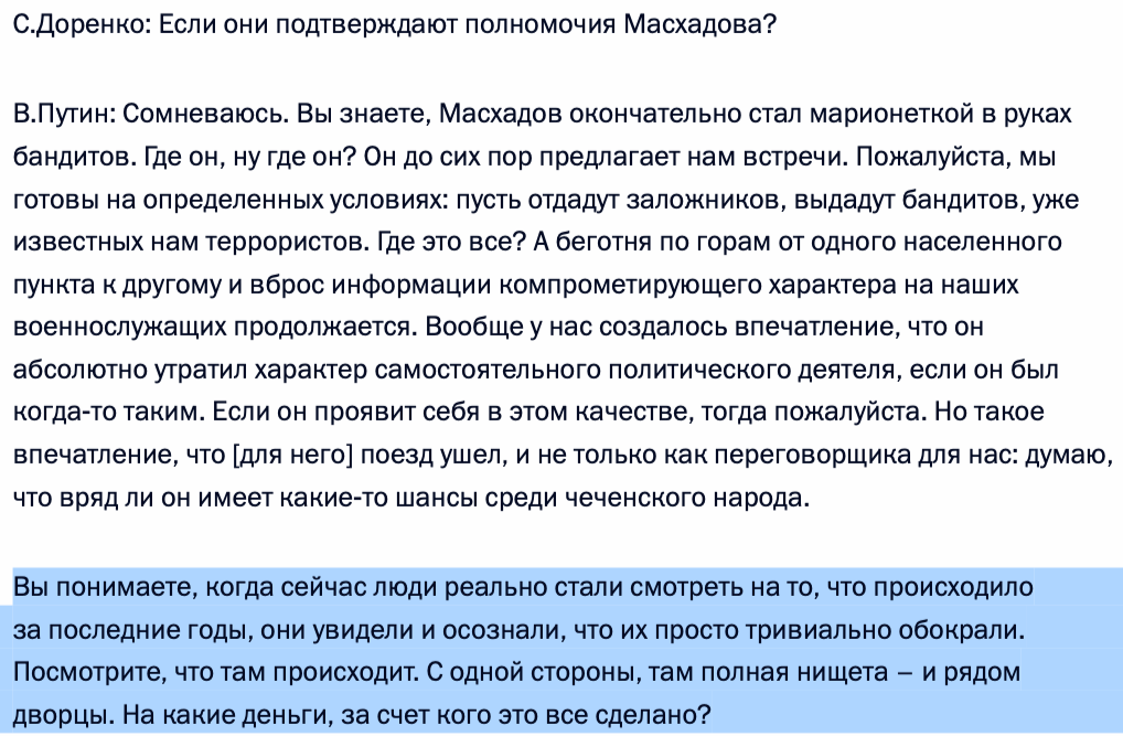 Сергей Доренко тогда задал вопрос В.В. Путину что будет, если жители Чечни выберут Масхадова на роль своего президента. На что Владимир Владимирович ответил, что сомневается, так как "Масхадов окончательно стал марионеткой в руках бандитов..."