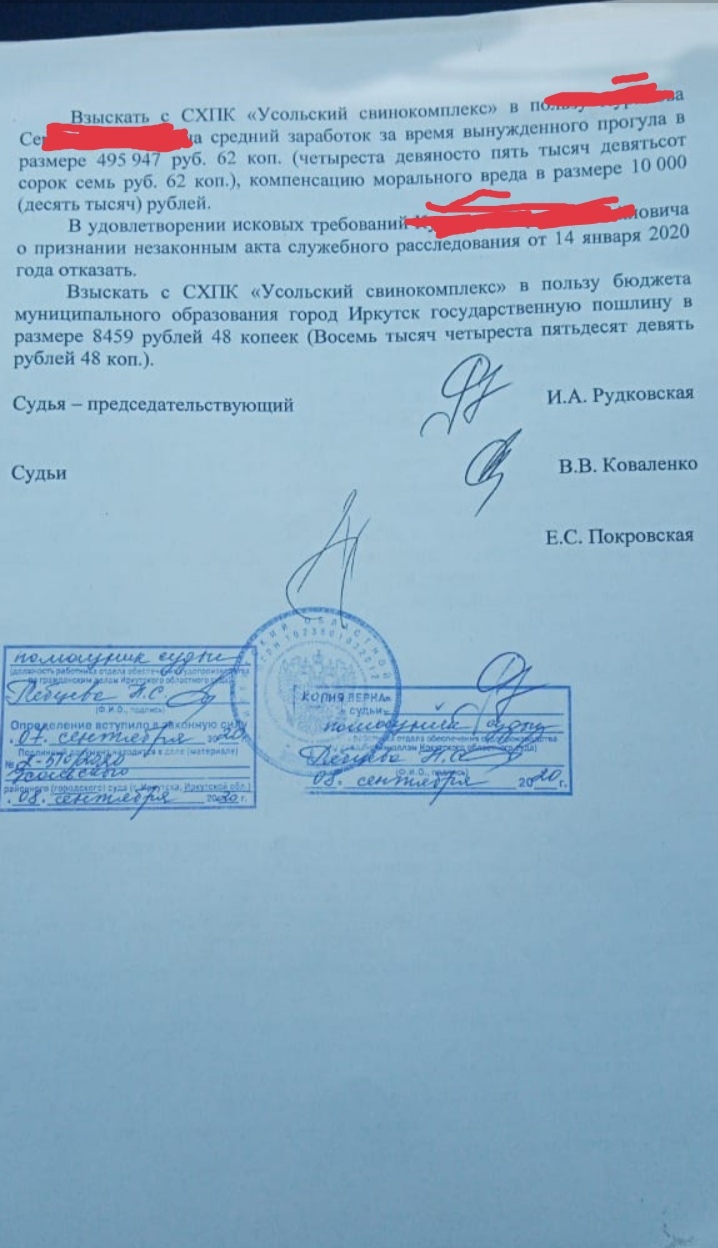 Тем не менее я подала апелляционную жалобу, прокуратура г. Усолье-Сибирское поддержала нас, подав апелляционное представление. После множества судебных заседаний, заслушивания новых и новых зачастую абсурдных доводов представителей ответчика (в составе аж четырех человек, юристов) 7 сентября 2020 года наша апелляционная жалоба была удовлетворена, по делу вынесено решение об удовлетворении наших исковых требований, восстановлении на работе и взыскании компенсации дней вынужденного прогула.