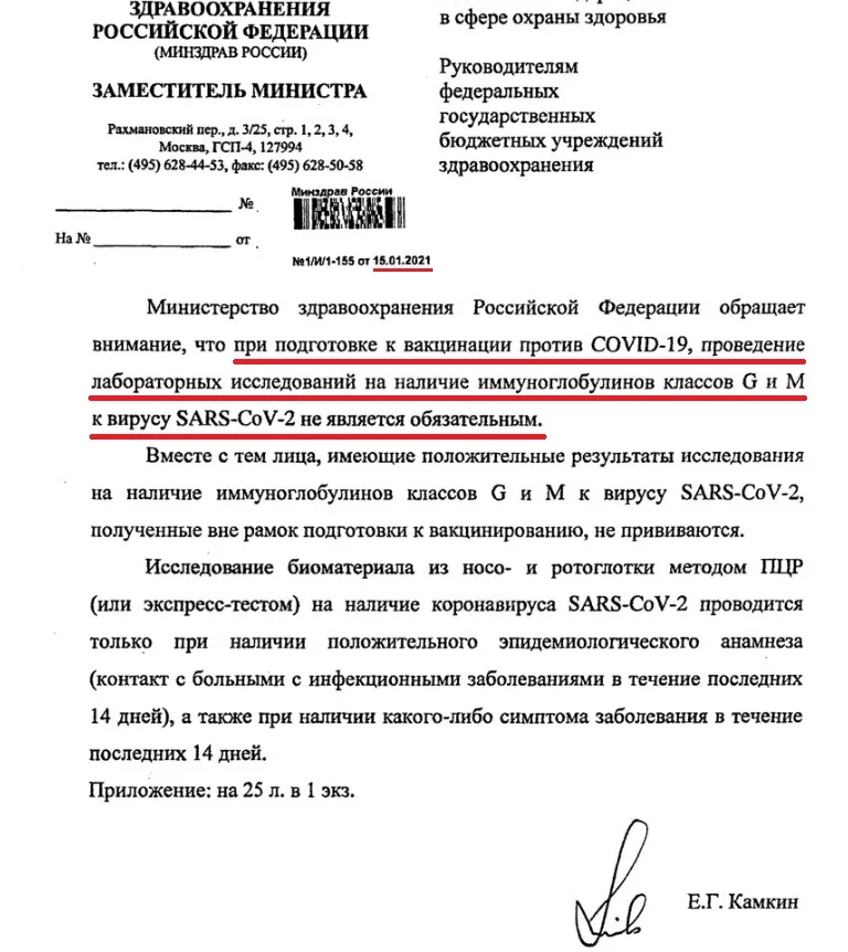 Министерство здравоохранения сразу же после распоряжения Путина о начале массовой вакцинации – 15 января – разослало письмо, в котором обращает внимание, что «при подготовке к вакцинации проведение лабораторных исследований на наличие иммуноглобулинов класса G и M к вирусу не является обязательным».