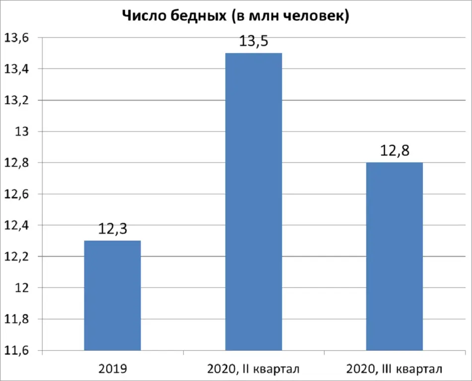 Кстати, в 2019 году бедных в стране насчитывалось примерно 18 млн., или 12,3% от общей численности населения страны. Так что вырисовывается следующая картина: