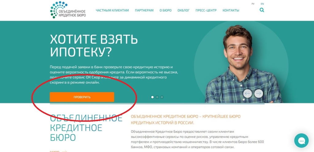 Переходим сразу к делу. Вводим в поисковике аббревиатуру “ОКБ” — объединенное кредитное бюро. Заходим на официальный сайт и нажимаем кнопку “проверить”. Далее выбираем более подходящий способ входа для проверки истории: через кабинет в Госуслугах, через Сбербанк или с помощью логина и пароля. Специалисты рекомендуют заходить именно с помощью данных Госуслуг.