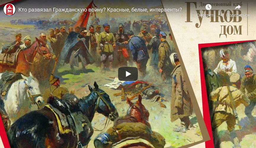 Российское военно-историческое общество продолжает реализацию проекта дискуссионного клуба «Гучков Дом». Состоялось очередное заседание по теме «Кто развязал Гражданскую войну? Красные, белые, интервенты?», в ходе которого эксперты обсудили объективные и субъективные факторы начала Гражданской войны. Попутно были затронуты следующие вопросы: Являлась ли Октябрьская революция спусковым крючком 5-летнего гражданского противостояния? На стороне каких политических сил находилась большая часть населения и как трансформировались ее симпатии? Могли ли «белые» победить? Какова роль внешнего фактора в Гражданской войне? Модератор – Мягков Михаил Юрьевич, д.ист. н., Научный директор РВИО Участники: - Ушаков Александр Иванович – д.ист. н., писатель - Вовк Алексей Юрьевич – к.ист. н., учитель истории - Ратьковский Илья Сергеевич – к.ист. н., доцент СПбГУ - Гребенкин Игорь Николаевич – д.ист. н., профессор РГУ им. С. Есенина - Агафонов Сергей Валерьевич – учитель высшей категории, соавтор учебников по отечественной истории - Цветков Василий Жанович – д.ист. н., профессор МПГУ
