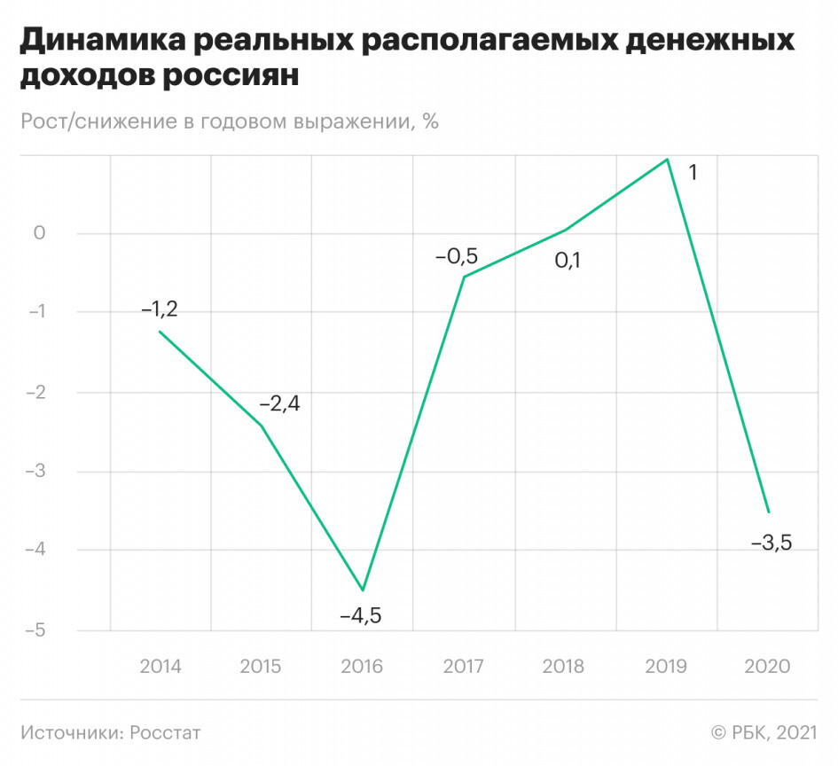 На фоне пандемического кризиса реальные располагаемые доходы россиян по итогам 2020 года упали на 3,5%, оценил Росстат. Теперь они отстают более чем на 10% от уровня 2013 года. За чертой бедности живут 19,6 миллионов россиян. Количество бедных увеличилось на 400 тысяч человек.