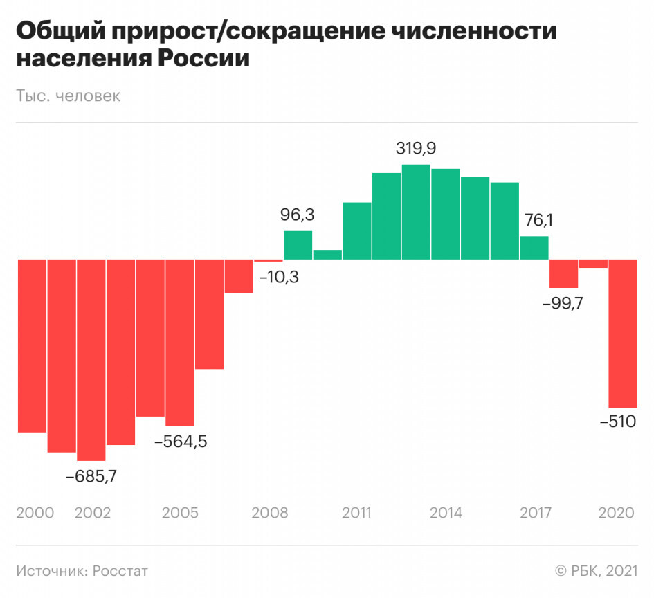 Самый печальный итог - численность постоянного населения России на 1 января 2021 года, по предварительной оценке Росстата, составила 146,24 миллионов человек, что на 510 тысяч человек меньше, чем на 1 января 2020 года (146,75 миллионов человек). Это максимальное падение численности населения за последние 15 лет.