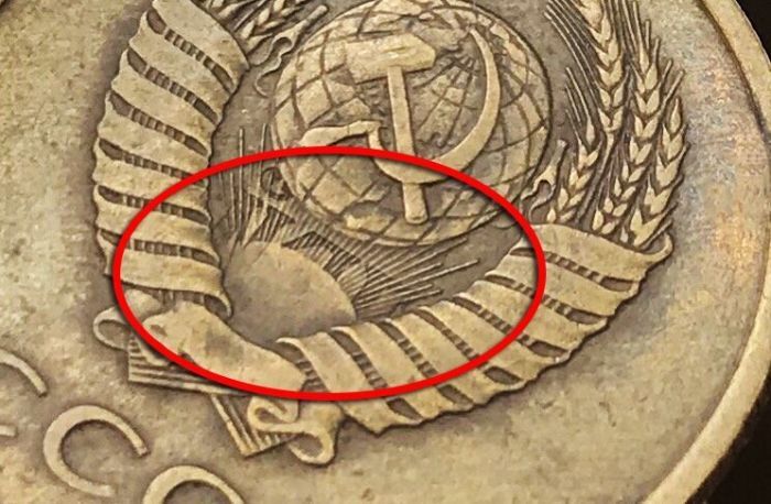 На поздних деньгах СССР, если точнее, на некоторых монетах номиналом 3 копейки 1986 года (впрочем, говорят их можно увидеть на любой другой монете) можно встретить едва различимые в лучах герба буквы.