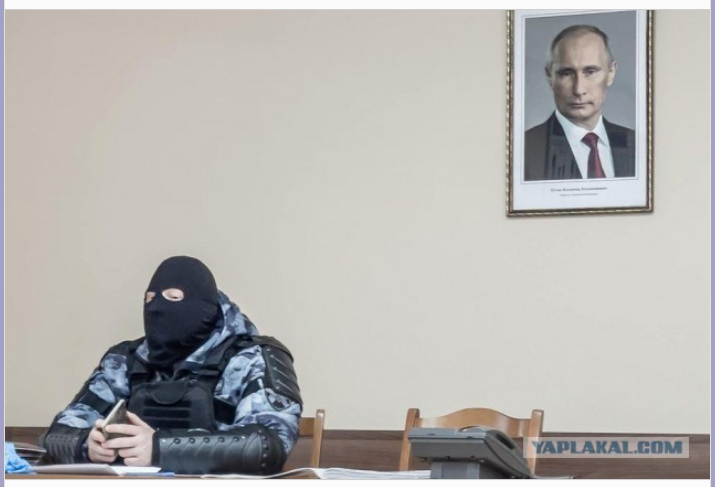 На фотографии сотрудник силовых структур сидит в полном обмундировании и балаклаве в кабинете за столом под портретом президента Владимира Путина.
