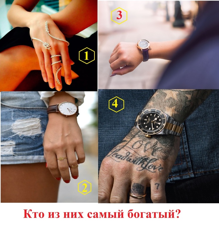 2 (часы показывают 2 часа)+3 х 1 (связка из 3-х бананов)+[3 х 1 (связка из 3-х бананов) х 11 (кол-во вершин в многоугольниках)]=2+3+3 х 11=5+33=38. После такой сложной задачи предложенную на рисунке задачку "Кто из них самый богатый, - номер 1, 2, 3 или 4 ?" можно решить за 15 секунд.