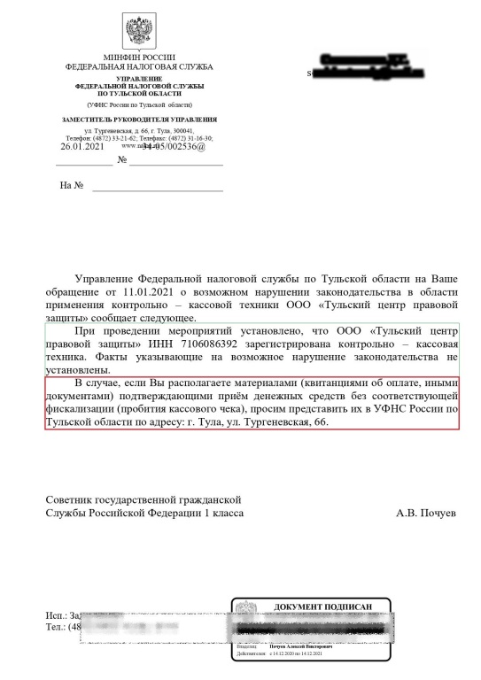 По своей маленькой судебной практике я знаю, что судьи очень любят, когда в делах есть чеки-ордера Сбербанка и чеки Почты России. И я нашел главного государственного налогового инспектора в Туле – М.З., который лучше всех знает про применение онлайн-касс в Туле. Его ответ есть в этом посте. В ООО «Тульский центр правовой защиты» все хорошо и спокойно.