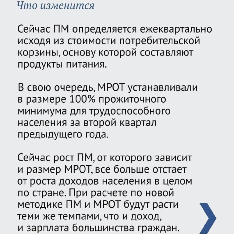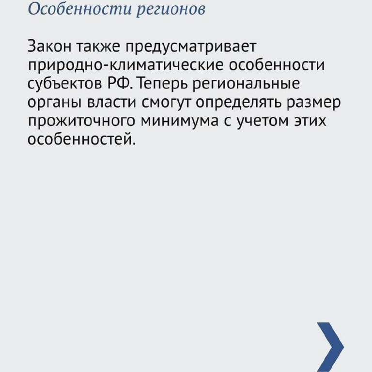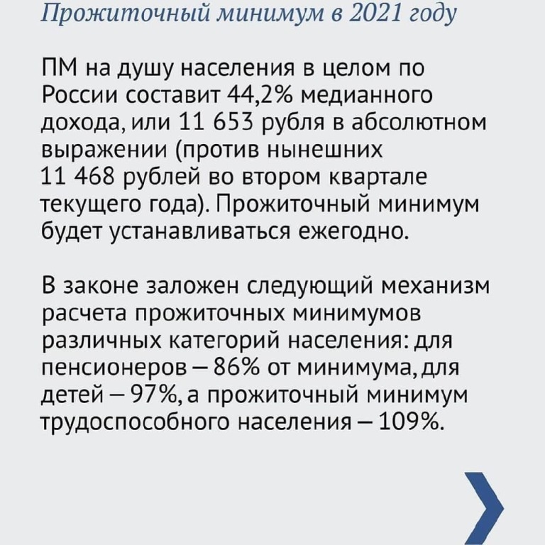 Изменения в Федеральный закон от 24 октября 1997 г. № 134-ФЗ "О прожиточном минимуме в Российской Федерации" предусматривают, что соотношение величины прожиточного минимума на душу населения в целом по РФ и величины медианного среднедушевого дохода за предыдущий год с 2021 года устанавливается в размере 44,2%. Это соотношение будет пересматриваться не реже одного раза в 5 лет.