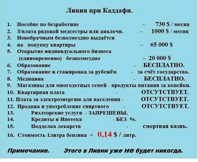 Вытье, нытье, но НАПОЛОВИНУ правда. Есть варианты, предложения? Вот читаю вас и вам подобных, которые в открытую или исподтишка подталкивают к революции по типу 1917 года. У меня пока нет предложений. Я думаю.. Но вот ЯРКИЙ пример, как люди повелись на такие провокации. И это не УКРАИНА. 15 февраля 2011 года,10 лет назад в Ливии начались первые демонстрации против каддафи. Затем его свергли и убили. Ожидали райской жизни.