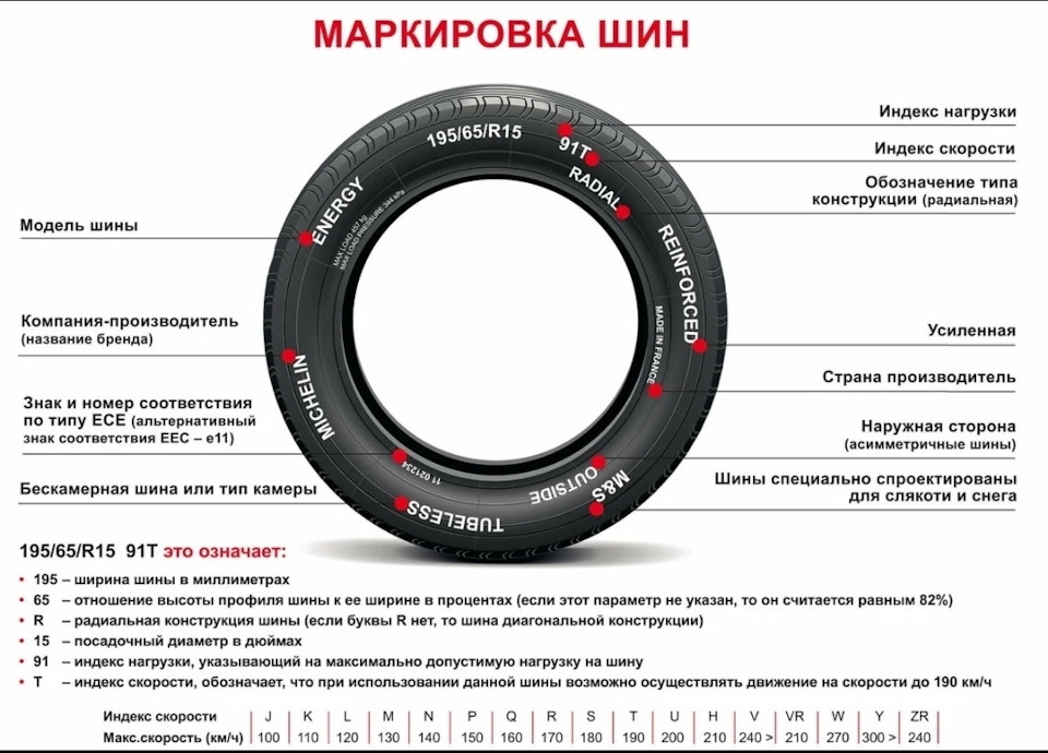 Кроме размерных параметров код маркировки должен содержать информацию о стране-изготовителе, наименование производителя, данные об импортере, дату изготовления, срок возможной эксплуатации, информацию о температурных условиях для использования шин.