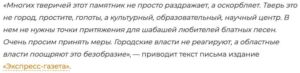 Источник https://tverigrad.ru/publication/veteran-mvd-trebuet-snesti-pamjatnik-mihailu-krugu-v-tveri/