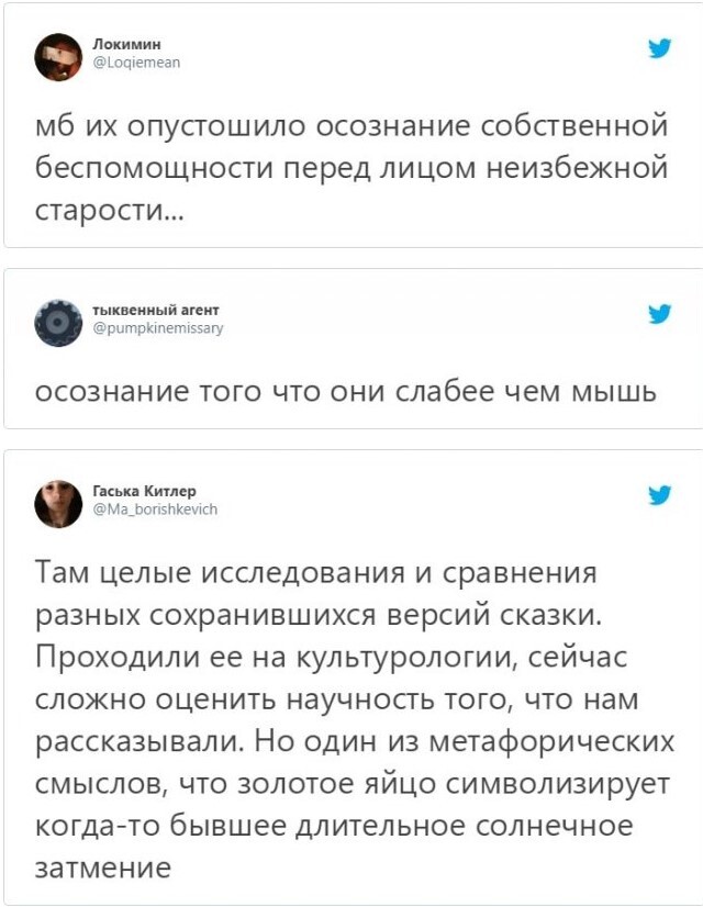 Кто бы мог думать, что в интернете много лет разворачиваются философские дискуссии на тему "а какой смысл заложен в сказке?". Зачем бабка и дед хотели разбить золотое яичко? Почему вдруг так расстроились, когда мышка его разбила, ведь они сами тоже хотели его разбить?