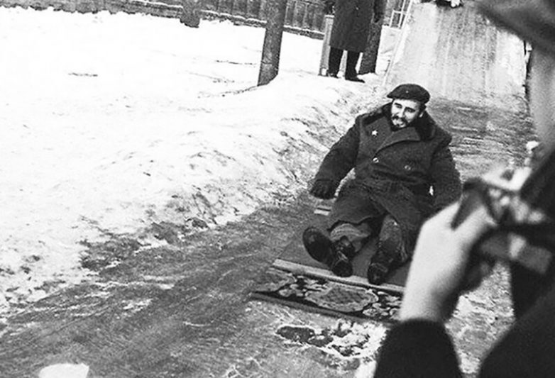 Фидель Кастро во время посещения Москвы, катается на горке в 1964 году