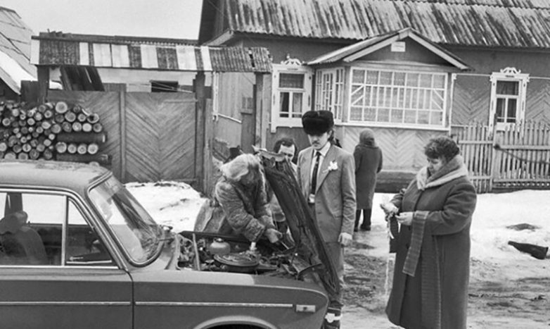 Своими руками украшают машину к свадьбе, дер. Шешуево, Брянская обл 1990 год