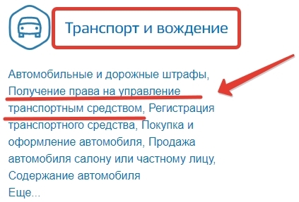 - В разделе «Транспорт и вождение» выбрать пункт «Получение права на управление транспортным средством».