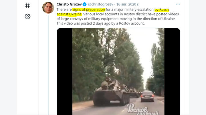 Грозев в 2014 году через все свои ресурсы выставлял Россию "агрессором", напавшим на Украину. Он публиковал большое число фейков о присутствии там русских военных в характерном камуфляже, о движении техники, солдат. Даже впоследствии Грозев не унимался и не гнушался распространять слухи о том, что Россия собирается скоро напасть на Украину крупными силами. В 2020 году в своём Twitter, например, он опубликовал без ссылки на источники некое видео о проезде колонны военной техники в Ростовской области. По мнению Грозева, это указывало тогда на подготовку России к нападению.