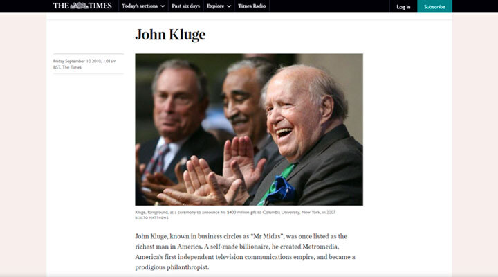 Кстати, западные СМИ упорно скрывают принадлежность Клюге к американской разведке. Стараются об этом не трубить. Как писал Forbes, до 1991 года Клюге считался богатейшим человеком США, его состояние превышало 5 млрд долларов. За год до смерти в рейтинге Forbes он занимал 35-е место. Лондонская Times, например, говорит нам, что Клюге, известный также как "мистер Мидас" – просто миллиардер, основавший первую в Америке независимую медиаимперию. Но мы можем себе представить, насколько в действительности мог быть "независимым" кадровый офицер американской разведки.