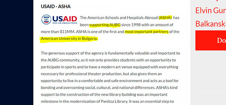 Третий спонсор не менее интересен. Это Фонд "Америка для Болгарии" (America for Bulgaria foundation, ABF), выделивший Американскому университету по крайней мере 22 млн долларов на выплаты стипендий и поддержку студентов (данные с сайта вуза). На сайте самого ABF сказано, что он был основан в 1991 году американским Конгрессом и USAID.