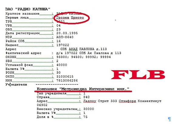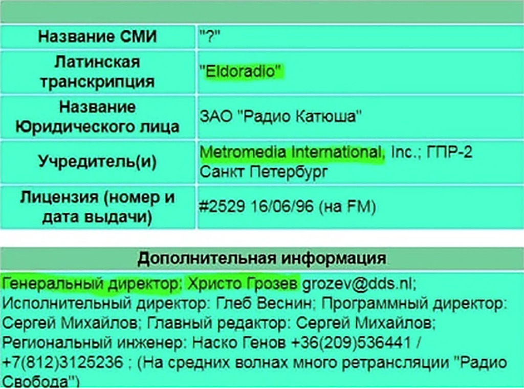 Наши коллеги из издания FLB, занимающегося расследованиями, нашли указание на Грозева как на "первое лицо" в ЗАО "Радио Катюша".