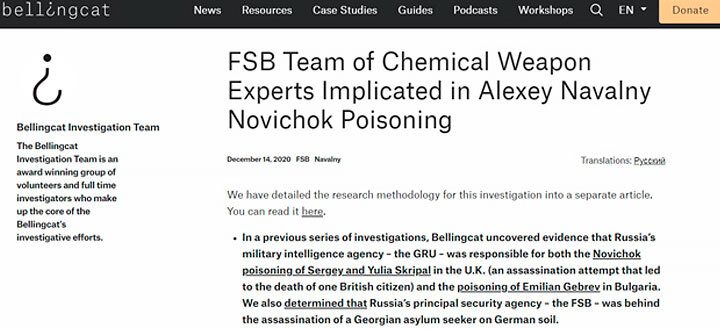 Затем были "расследования" Bellingcat об отравлении Скрипалей, где якобы подтверждалось применение "Новичка". Там говорилось, что подозреваемые работали на ГРУ (так на Западе называют ГУ Генштаба России), и так далее.