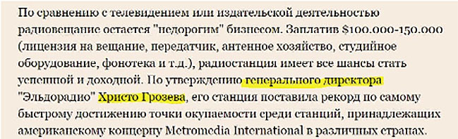 Таким образом, мы можем утверждать, что Христо Грозев сразу после университета выбрал себе карьеру пропагандиста и вступил в более тесную связь с американскими спецслужбами, начав работать на Клюге. Более того, Грозев по личному приказу своего босса отправился открывать в России сеть пропагандистских радиостанций.