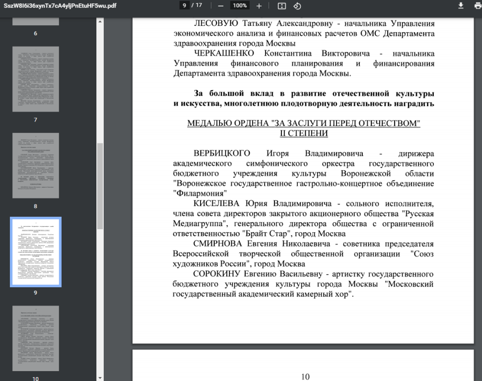 Заглянула в ссылку, на которую ссылается автор. Там фигурирует Кесслер Юрий Александрович, а где Киселев? А, нашла. Да, указано: сольного певца и т.д. А ещё увидела сколько награждают людей, о которых никто никогда не слышал. Но какие должности занимают! Чего стоит "отдел по оздоровлению детей и родовспоможению! Сколько дармоедов, и ведь зарплаты исчисляются сотнями тысяч. Несчастный народ сколько же ему ещё содержать их и получать копейки, выйдя на пенсию. С народа сдираю последнее, чтобы кормить армию бюрократов абсолютно ничего не производящих.