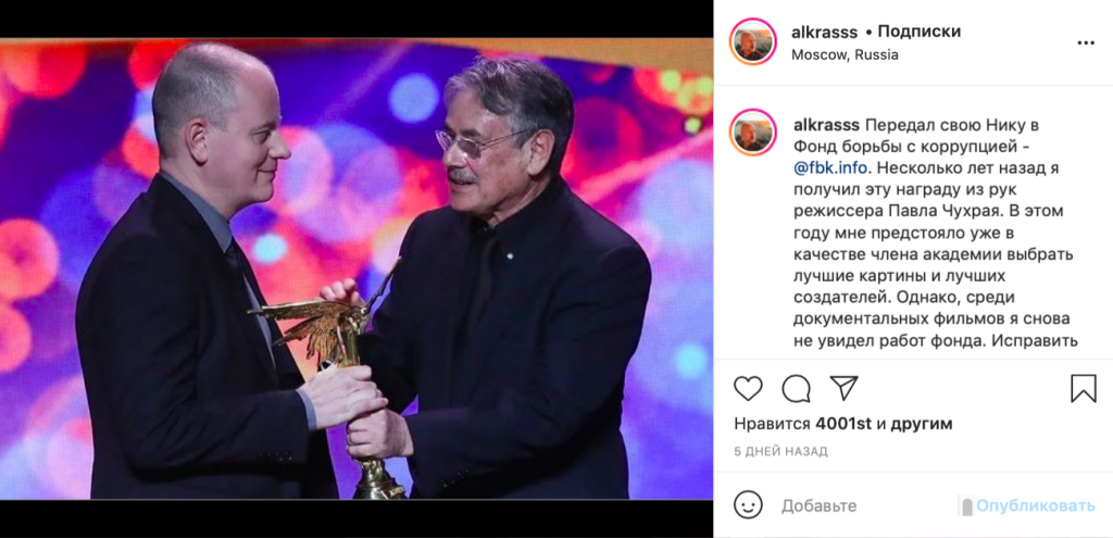 Российский режиссер и сценарист Алексей Олегович Красовский передал ФБК** свою кинематографическую премию «Ника» — бронзовую статуэтку крылатой древнегреческой богини Ники. Об этом он сам лично рассказал в своём Инстаграм: