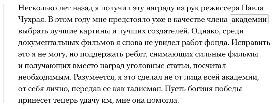 Я лично считаю, что фильм-расследование о "дворце Путина" достоен этой награды. Однако в связи с тем, что ФБК** внесён в реестр НКО, которые выполняют функции иноагентов (в соответствии с последними изменениями в российском законодательстве), то получить данную кинематографическую премию за документальные фильмы ФБК** ни практически, ни теоретически невозможно. Именно по этой причине от себя лично российский режиссёр Алексей Красовский и вручил свою "Нику" ребятам из ФБК**.