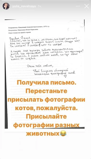 Юлия Навальная попросила подписчиков присылать мужу «фотографии разных животных», а не только котов.