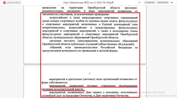 Он разрешает массовые спортивные состязания, общественные слушания, любые собрания в зрительных и актовых залах, а также мероприятия, посвященные Дню защитника Отечества и памяти воинов-интернационалистов. Есть еще один пункт – «мероприятий, проведение которых утверждено федеральными органами исполнительной власти».