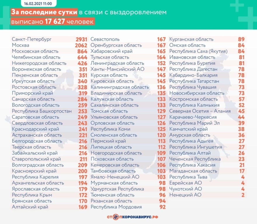 За последние сутки по состоянию на 16 февраля 2021 года в России: