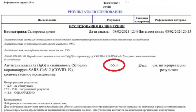 Получила 2-ю прививку Спутник, прошло 3 недели, сдала на антитела. (Со слов пациентки)