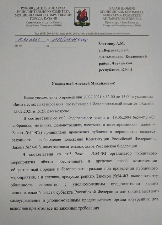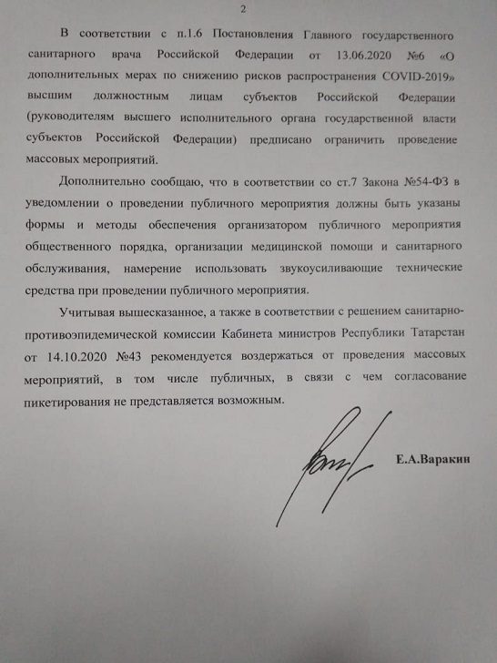 Вчера мне пришел ответ из Исполкома, который отказывают мне в согласовании пикета в количестве 20 человек, ссылаясь на санитарные ограничения, установленные главным санитарным врачом РФ в связи с пандемией.